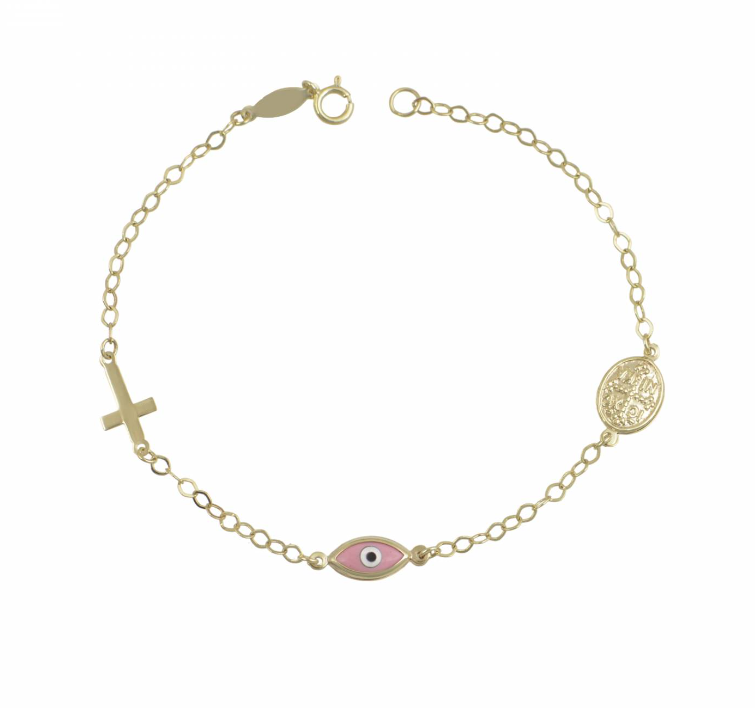 Βραχιόλι Παιδικό για κορίτσι από κίτρινο χρυσό Κ14 με ροζ ματάκι, σταυρό και κωνσταντινάτο στο πλάι
