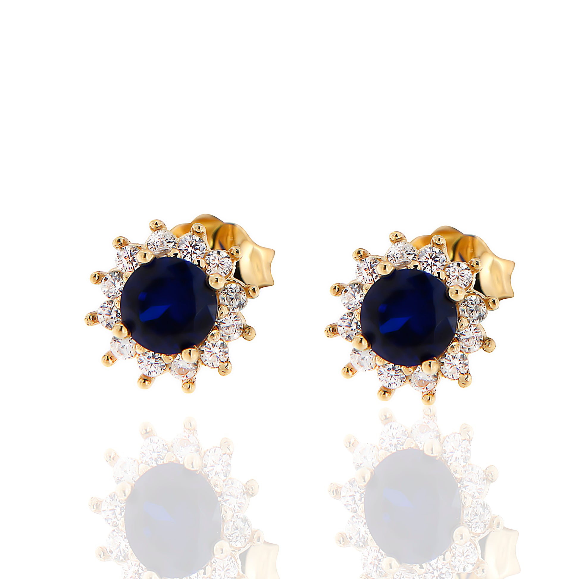 Σκουλαρίκι Ροζέτα από κίτρινο χρυσό 14 καρατίων με μπλέ ζιργκόν στο κέντρο και λευκές περιμετρικά